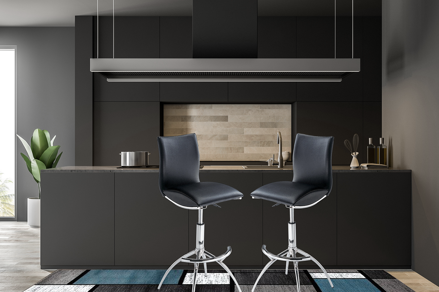 Seat and back in High-density foam with PVC imitation leather, frame in metal tube chrome plated with Gas lift & metal Legs.